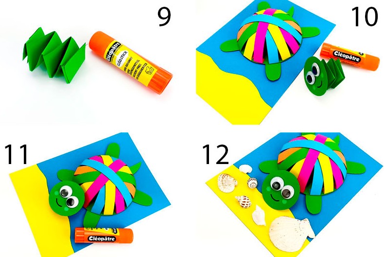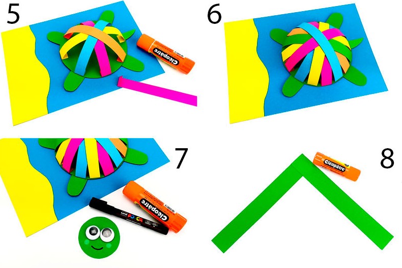 - Нарежьте цветную бумагу на полосы и приклейте к панцирю, как показано на изображении.