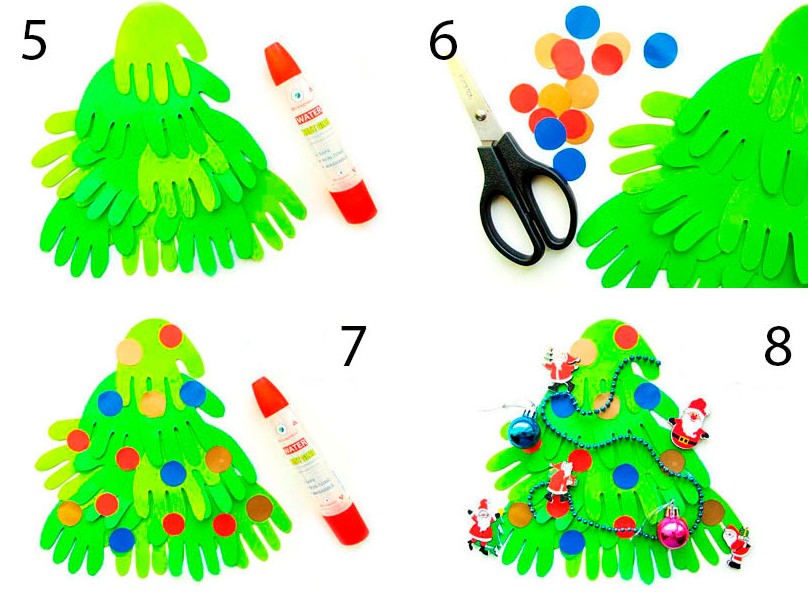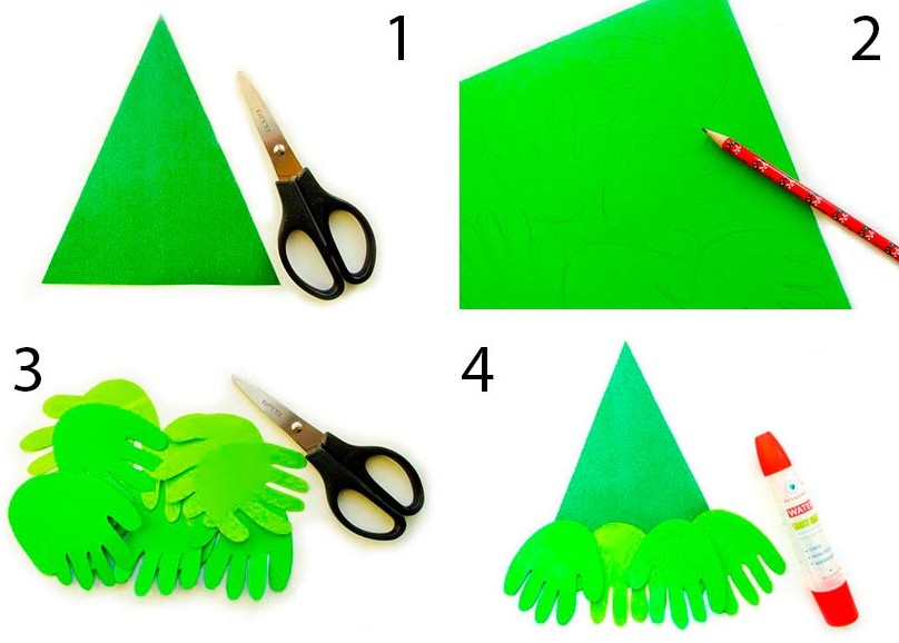 - Приклейте 2 тёмно-зелёные ладошки, а на верхушку приклейте светлую ладошку.