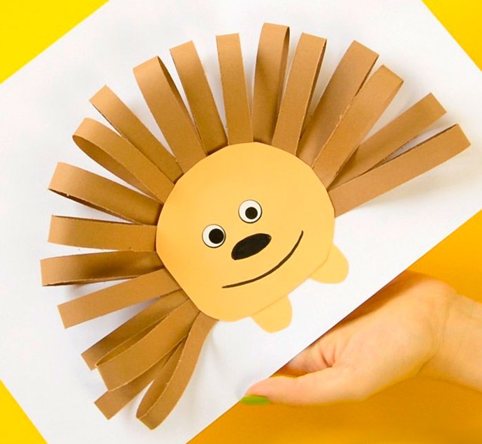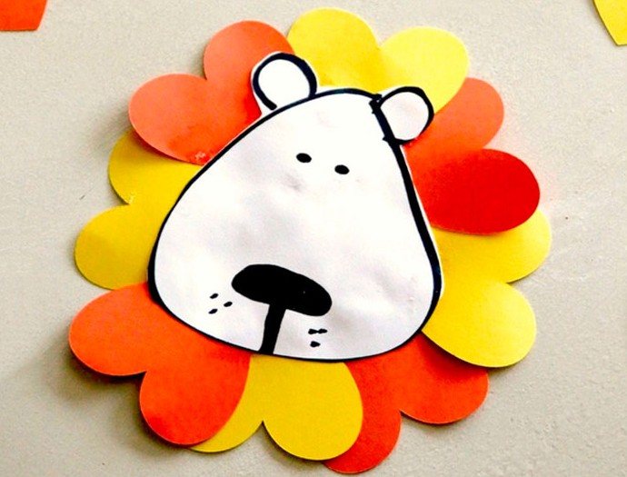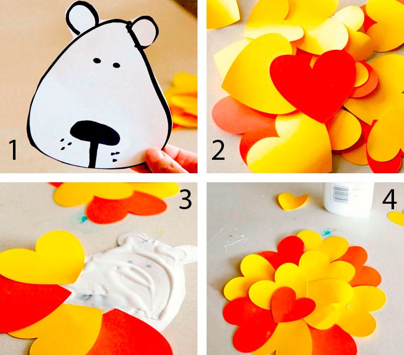 - Приклейте сердечки вокруг мордочки, чередуя цвета, сделав гриву львёнку.