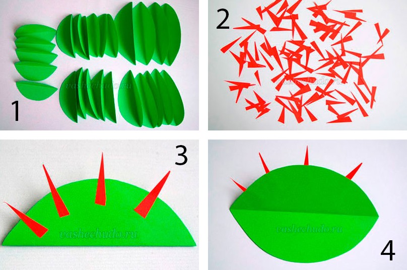 - Вырежьте 4 цветка из красной бумаги и приклейте к верхушкам кактусов, сделав их цветущими.