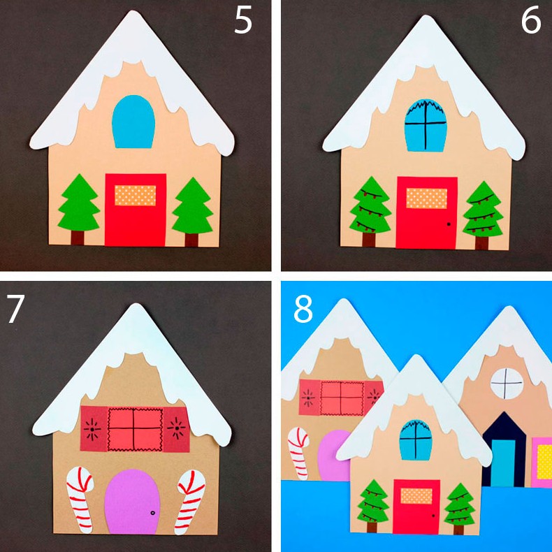 - Пофантазируйте и сделайте ещё пару домиков, затем приклейте х к голубому картону.