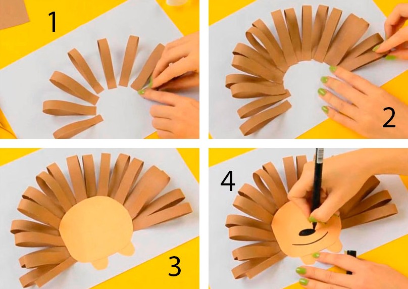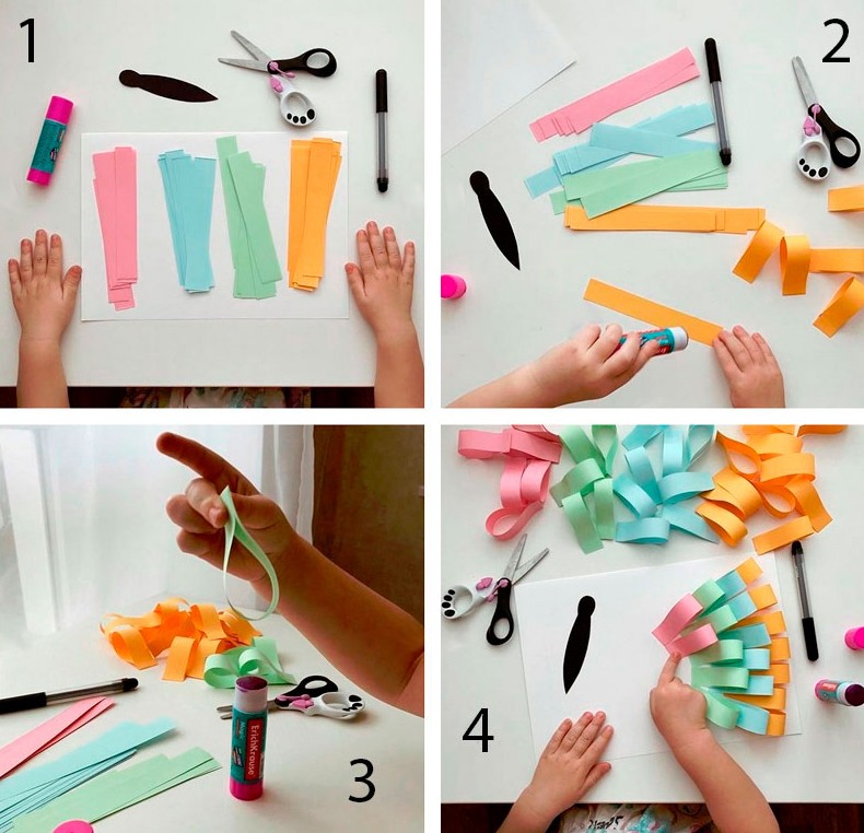 - Сложите полосы гармошкой и приклейте к голове, как показано на фото.