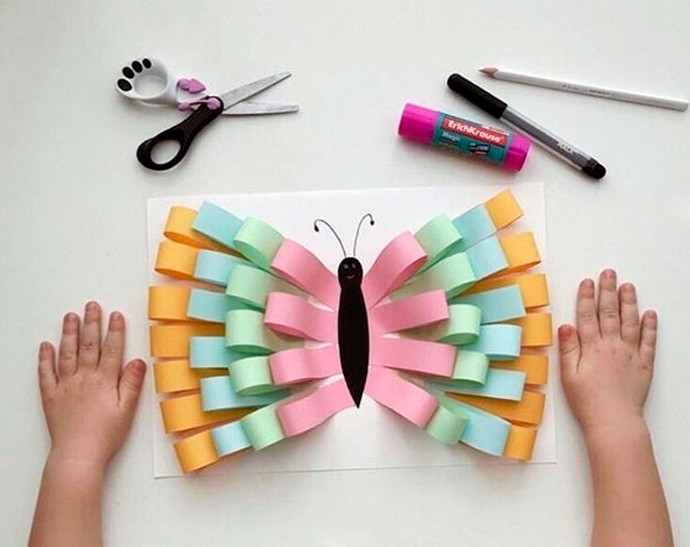 - Приклейте тельце бабочки и дорисуйте глазки, улыбку и усики.