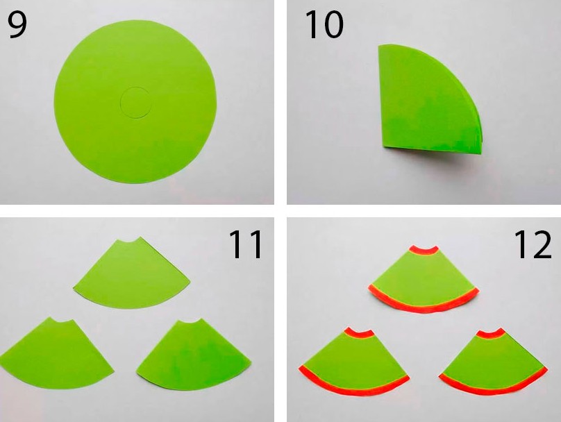 - Начертите на зелёной бумаге круг радиусом 10 см, вырежьте его, затем срежьте четверть круга.