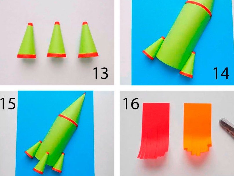 - Приклейте оранжевый прямоугольник сверху красного, сверните и приклейте внутрь стабилизатора (конуса) в качестве огня.