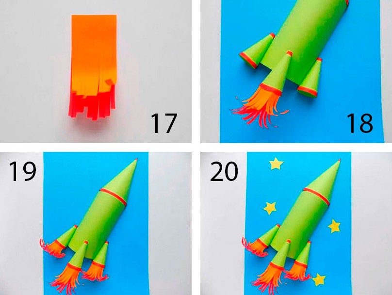 - Приклейте заготовку на лист голубой бумаги таким способом, чтобы получился объёмный корпус ракеты, как показано на изображении.