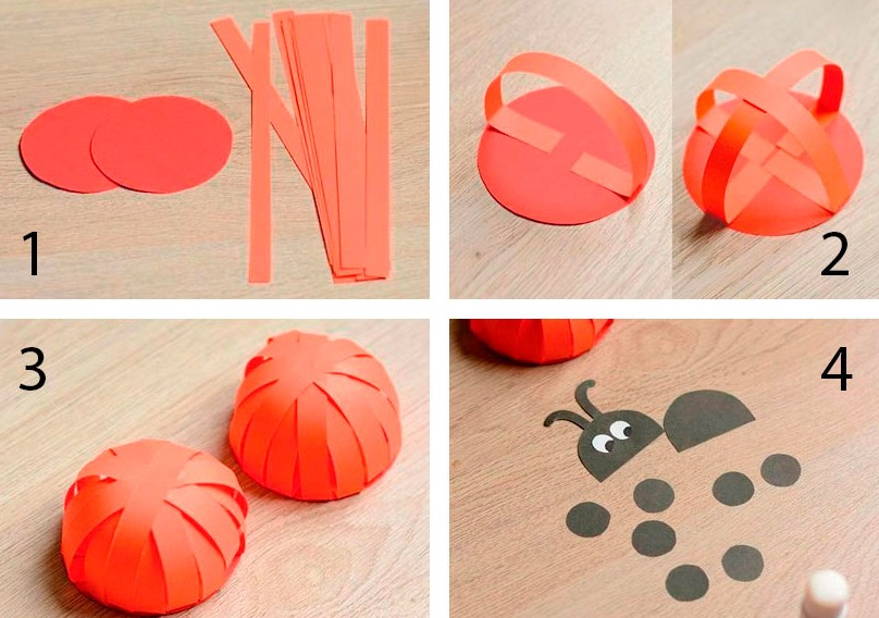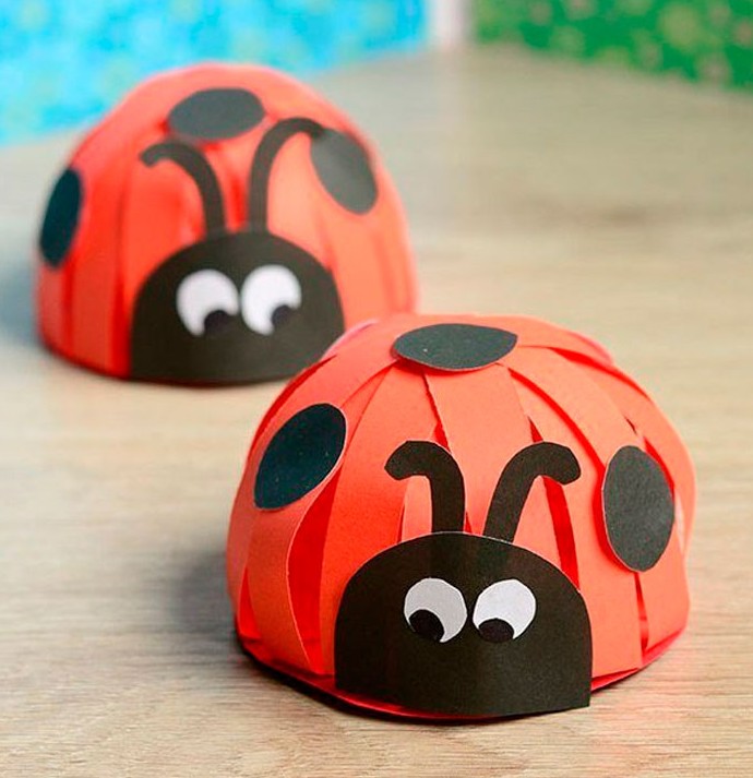 - Сделайте ещё одну Божью коровку таким же способом и приклейте их на зелёный лист с рисунком.