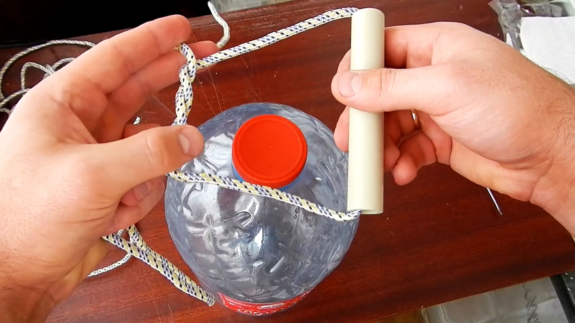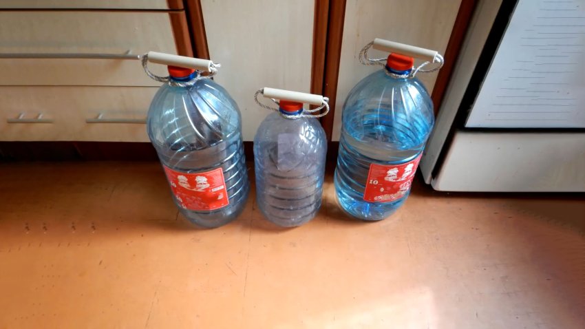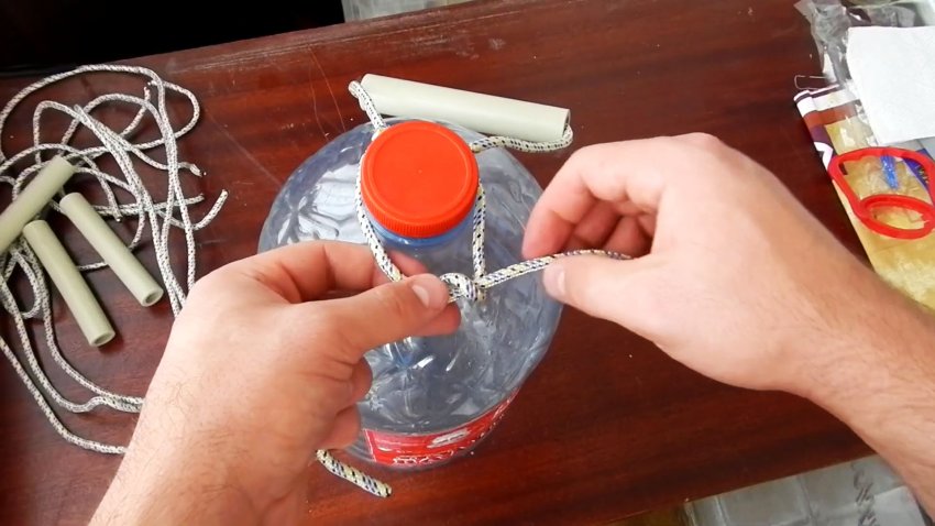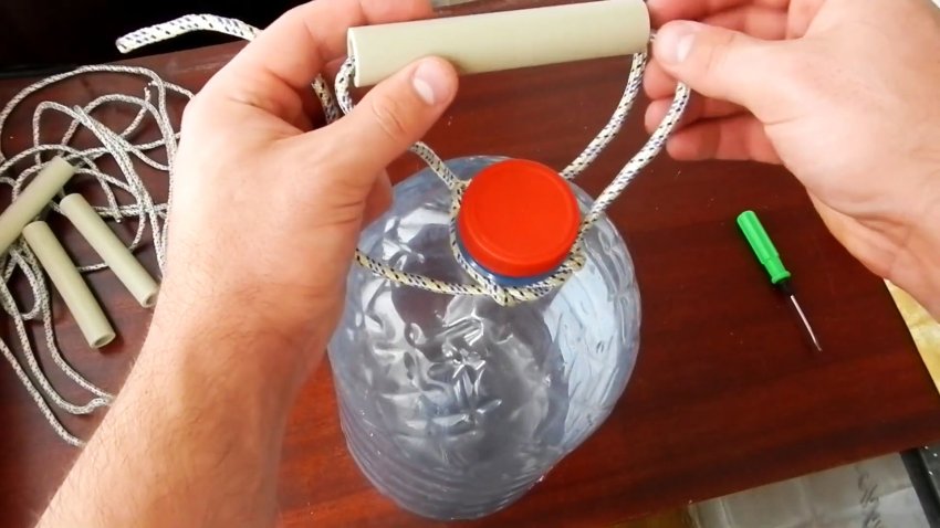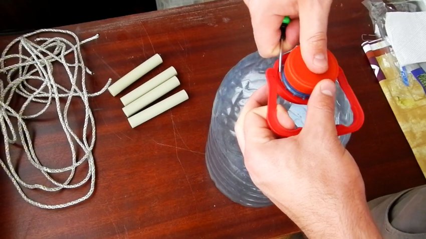 Для больших бутылей, например, на 18 литров, шнур нужно сделать длиннее — примерно на 10 см больше метра. Если ручка целая, лучше её снять и не выбрасывать, так как может пригодиться для других бутылок. Лучше сразу сделать удобную ручку, даже если бутыль планируется использовать недолго.