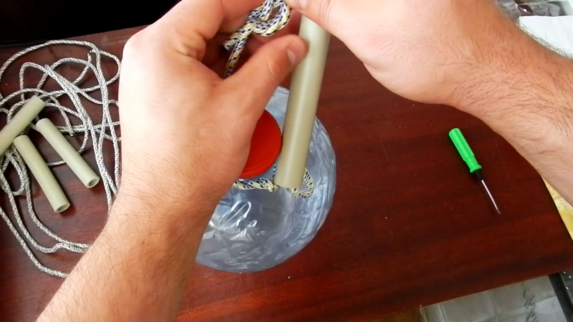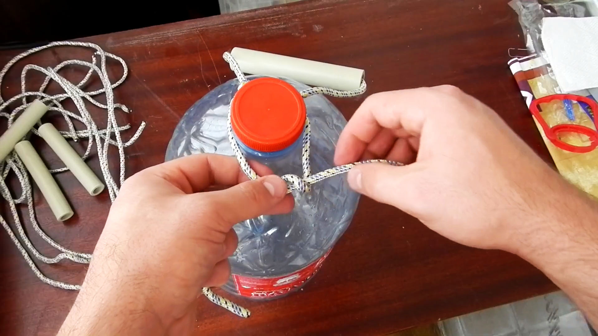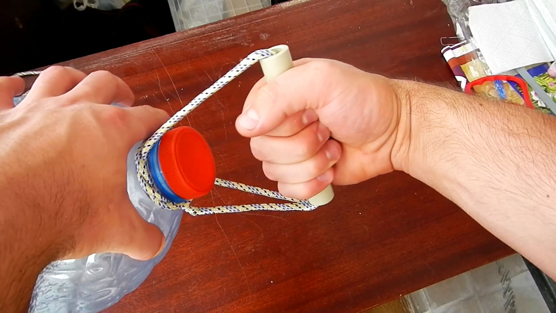 Длина ручки должна быть около 12 см. Она не должна болтаться и должна быть удобной для хвата. Веревку можно сделать немного короче, но не менее метра, иначе будет тяжело затянуть. Этот узел растягивается и легко снимается с бутыли, поэтому его можно использовать для нескольких бутылок.