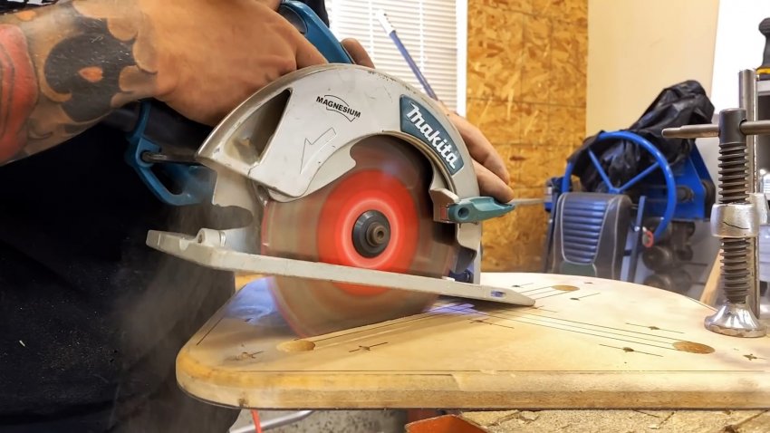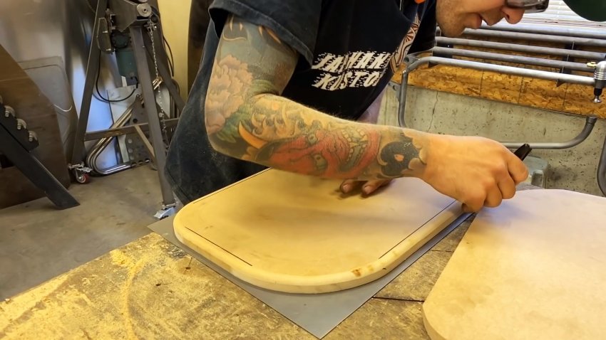 В паз нижней панели нужно выпилить ограничивающие глубину рейки. Они не позволят металлу выгнуться больше положенного, и порваться. К тому же с ними углубление получится однородным по глубине.