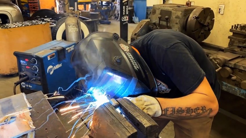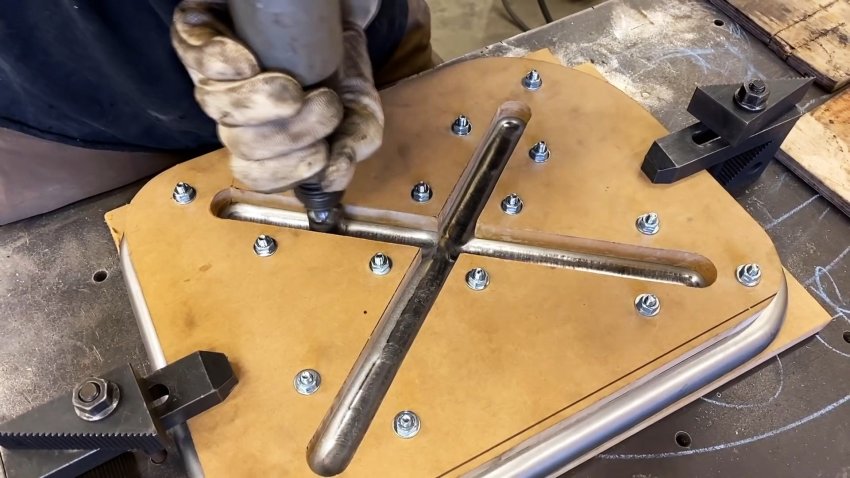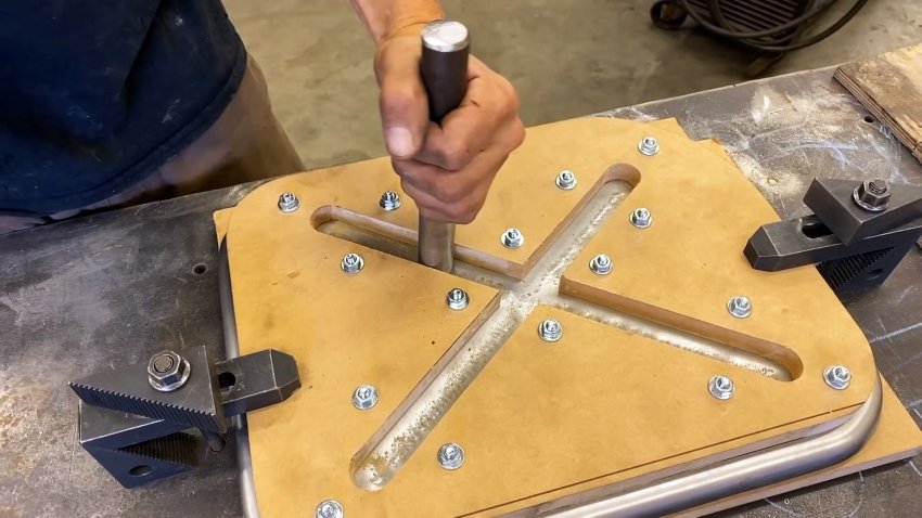 Если у вас имеется электрический или пневматический перфоратор, то можно сделать из прута набалдашник, и наварить его на биту. Тогда простучать рельеф получится куда быстрее и легче.
