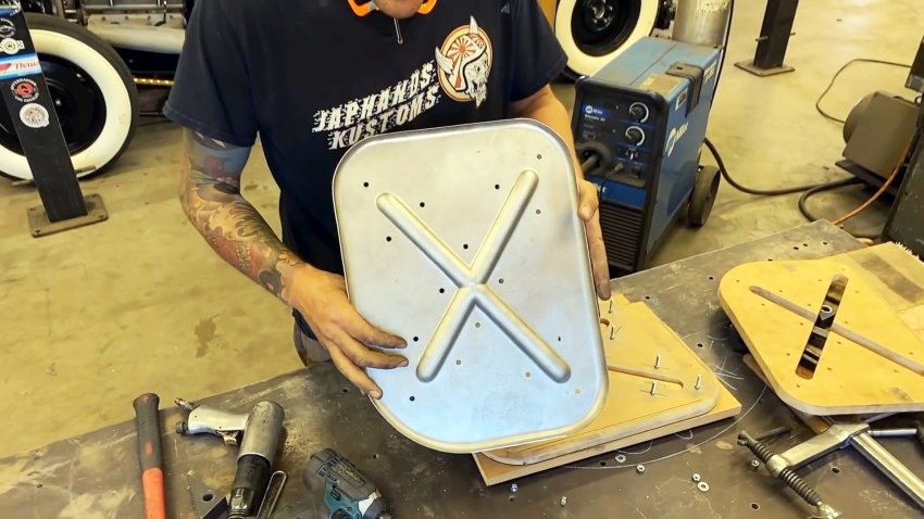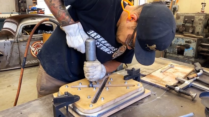 Порой может потребовать выгнуть из листового металла рельефную деталь, возможно даже с вогнутым или выпуклым рисунком. Это может быть крышка ящика, декоративная накладка и т.д. На производстве их получают прессованием между матрицами. Но есть технология, которая позволяет делать такие сложные детали в домашних условиях без пресса.