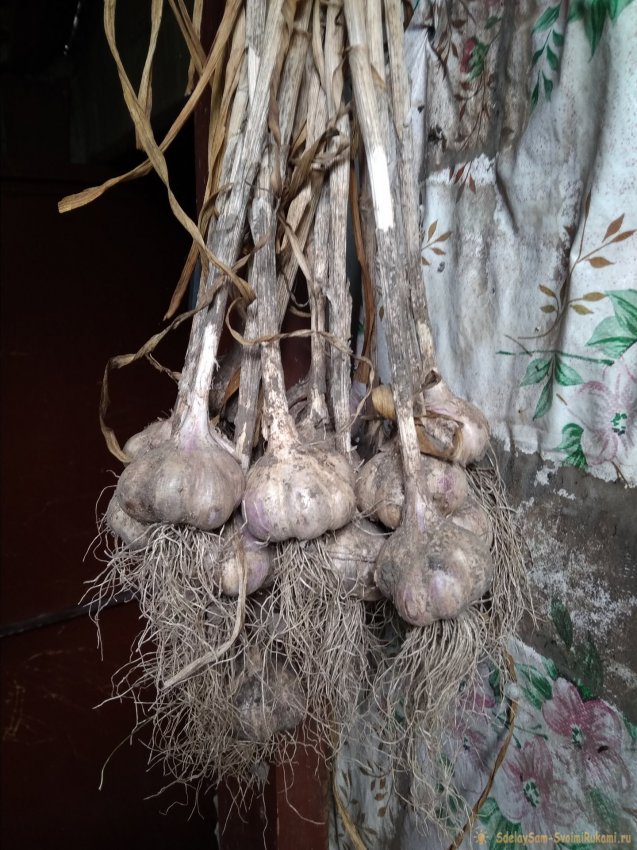 Старинный вариант, проверенный временем, – плетение кос. Сухие стебли чеснока переплетаются между собой и скрепляются с помощью бечевки. Такие красивые косы подвешивают под потолком в сарае или украшают ими стены кухни. Головки срезают поштучно, по мере кулинарной необходимости.
