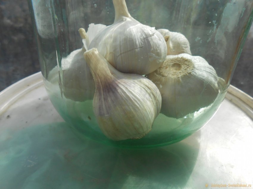 В трехлитровых банках чеснок хранить очень удобно. Стекленная тара предварительно дезинфицируется и просушивается. После заполнения банки головками ее накрывают марлей или широким бинтом, сложенным в 4-6 раз. Фиксируют импровизированную «дышащую» крышку с помощью тонкой резинки (для денег).