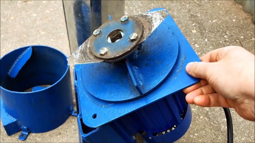 На корпус мотора приваривается стальная пластина, требуемая для крепления измельчительной камеры. В ее углах просверливаются отверстия. На вал двигателя нужно закрепить маховик из листовой стали с двумя ребрами в виде полос. Эти лопасти нужны, чтобы создавать завихрения, и выдувать рубленую траву из измельчителя. На конец вала устанавливается ротор. Тот представляет собой шкив либо диск, с прикрученными ножами от тракторной косилки.