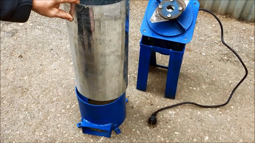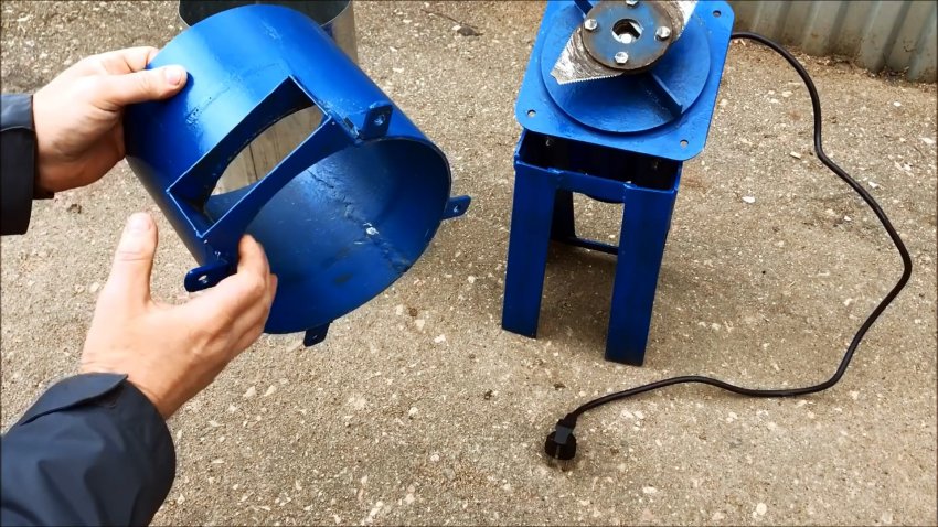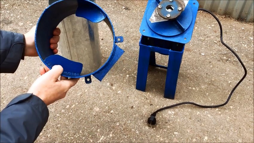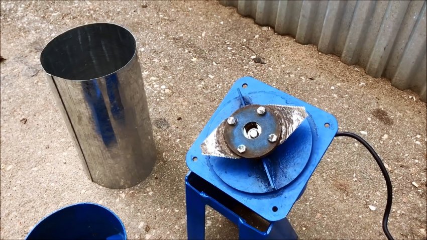 Цилиндрический корпус камеры измельчения делается из трубы большого диаметра, бочки, либо выгибается и сваривается с листовой стали. Внизу к нему приваривается 4 проушины, чтобы прикуривать его к пластине на моторе. Сбоку, напротив ротора, вырезается окно для выброса измельченной травы. Изнутри в цилиндрический корпус приваривается 2 направляющие воздушного потока. Они усилят завихрения, необходимые для выброса сечки.