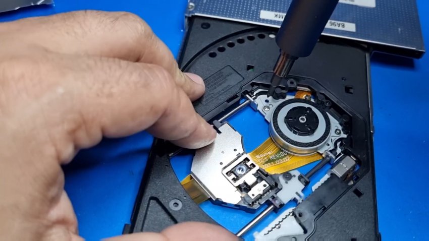 Для начала нужно открыть DVD привод, чтобы добраться до его моторчика. Тот необходимо демонтировать. Для этого откручивается крышка и срывается шлейф. Чтобы разобрать моторчик, нужно его поддеть отверткой, и тот без проблем раскроется.