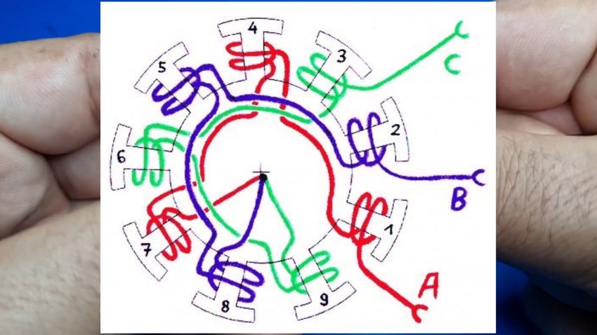 Важно придерживаться представленной схемы намотки. Цельный отрезок проволоки без разрывов наматывается на 1, 4 и 7-й зубец. Затем второй на зубцы 2, 5 и 8, а третий на 3, 6 и 9.