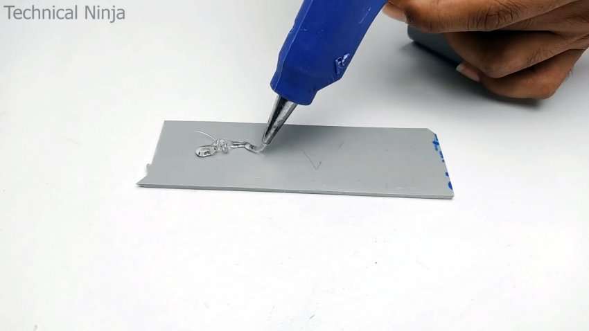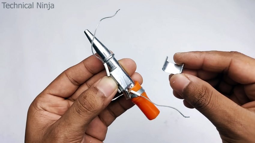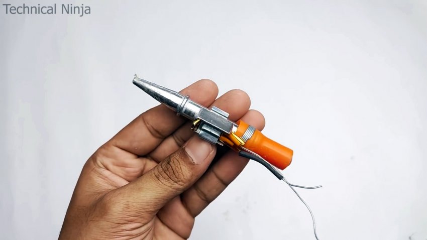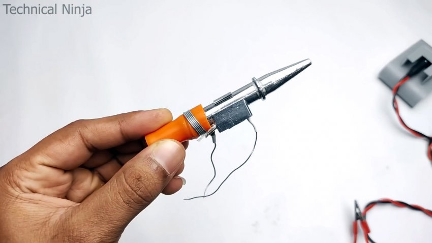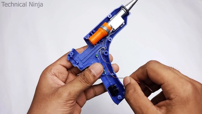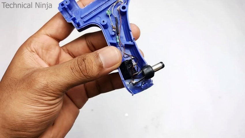 Провода нужно припаять к штекеру питания, и вклеить последний внизу рукояти, чтобы тот выходил вперед. Для этого используется эпоксидный клей. После пистолет собирается.