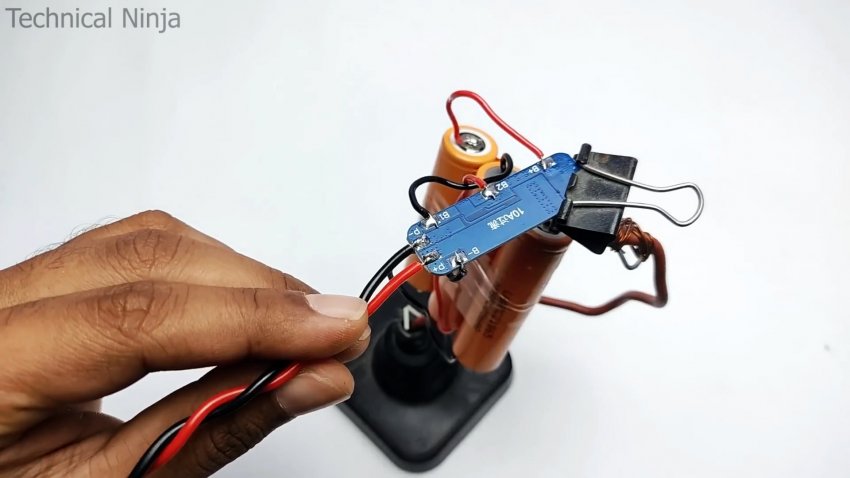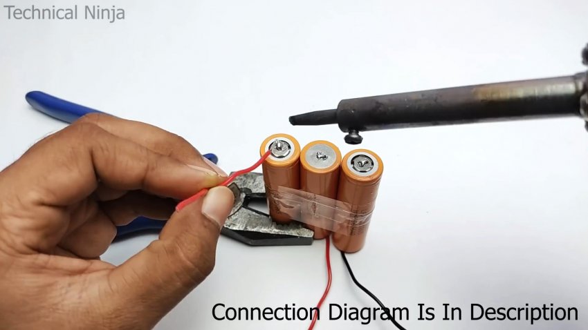 Далее следует заняться съемным аккумулятором для клеевого пистолета. Для этого последовательно соединяем 3 батареи типа 18650, чтобы получить 12В. Обратный блок припаивается к модулю BMS 12В, 10 А. Сразу же нужно подпаять провода для подключения разъема.