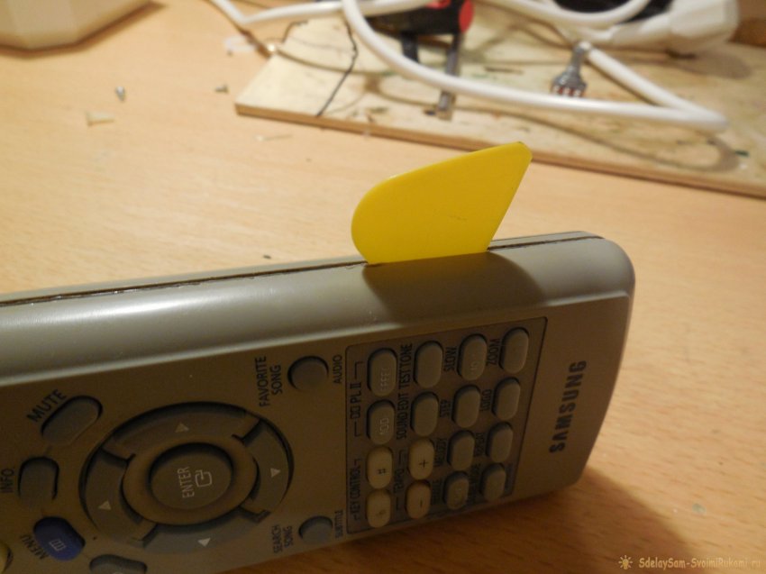 Первым делом пульт необходимо вскрыть, чаще всего две половинки корпуса держатся на защёлках. Необходимо найти место, например, на углу корпуса, в небольшой зазор просунуть тонкий предмет, весьма удобно для этого использовать гитарный медиатор. Необходимо расстегнуть защёлки по всему периметру, не сломав их при этом и не испортив края.