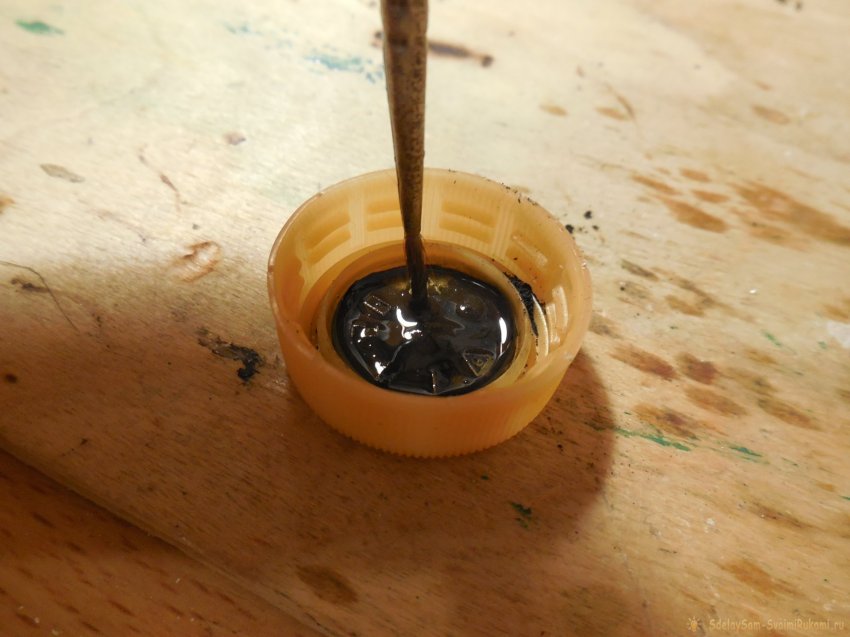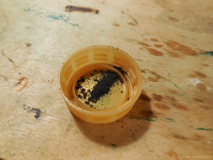 Лака нужно совсем чуть-чуть, буквально 1-2 капли, смешать его с порошком грифеля можно в крышечке от бутылки. Раствор желательно делать густым и насыщенным порошком, чтобы он обладал хорошей токопроводностью. К слову, вместо цапон-лака можно применить и другие лаки, какие найдутся под рукой.