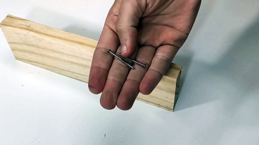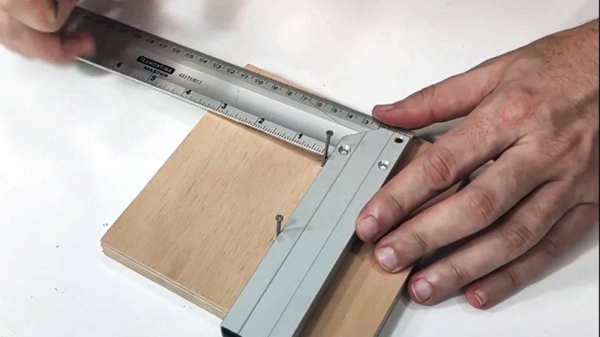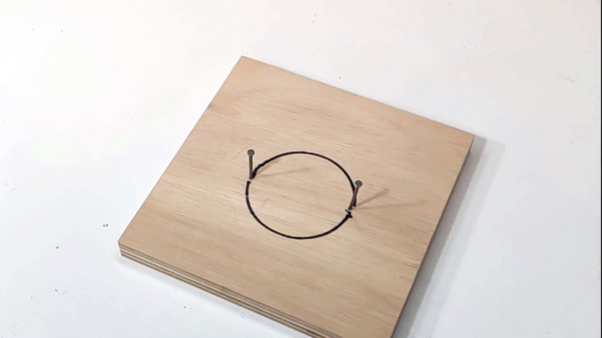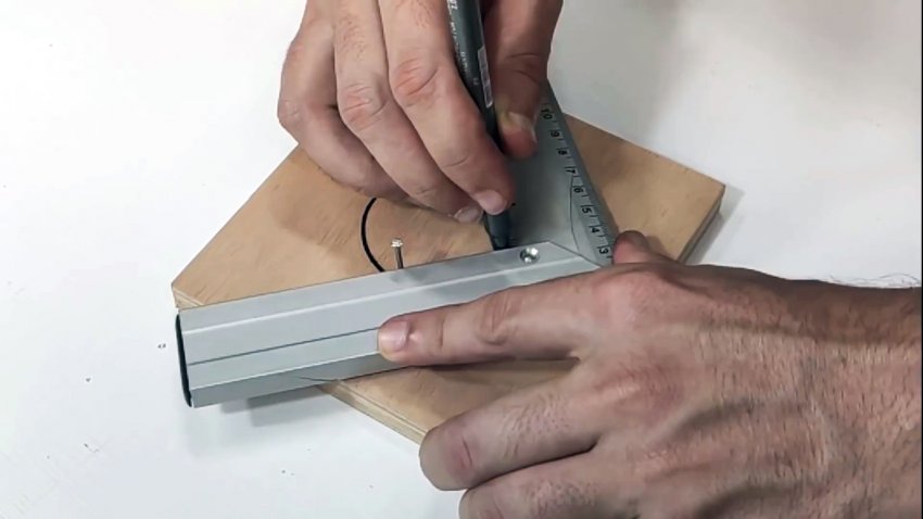 Если вам нужно разметить на заготовке круг, но у вас нет циркуля или круглого предмета чтобы его обвести, то можно использовать угольник. Для этого в деталь вбивается 2 гвоздя. Расстояние между ними должно быть равным диаметру необходимого круга.