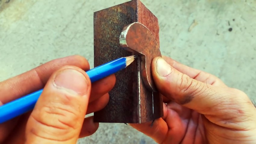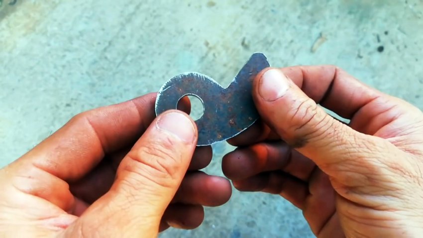 Из стальной пластины вырезаем заготовку защелки, похожую в плане на жирную запятую.