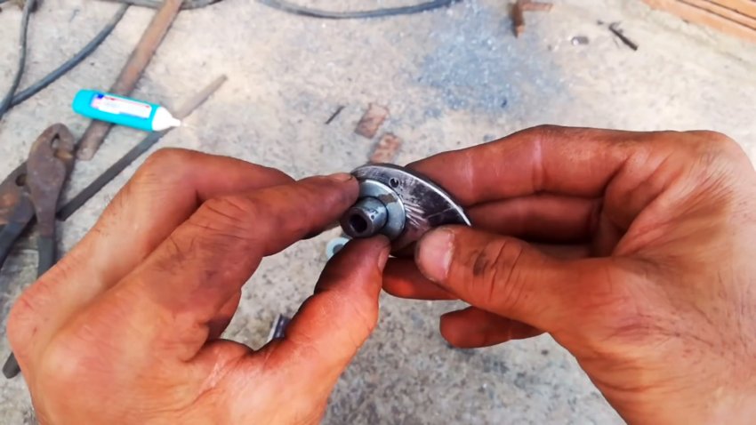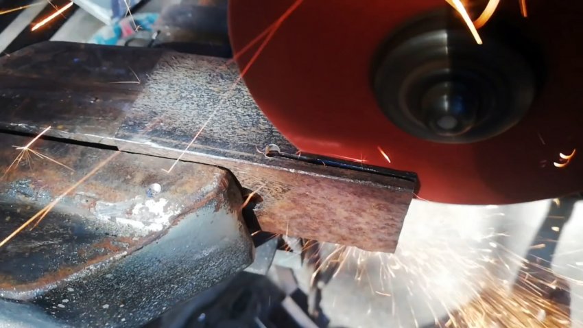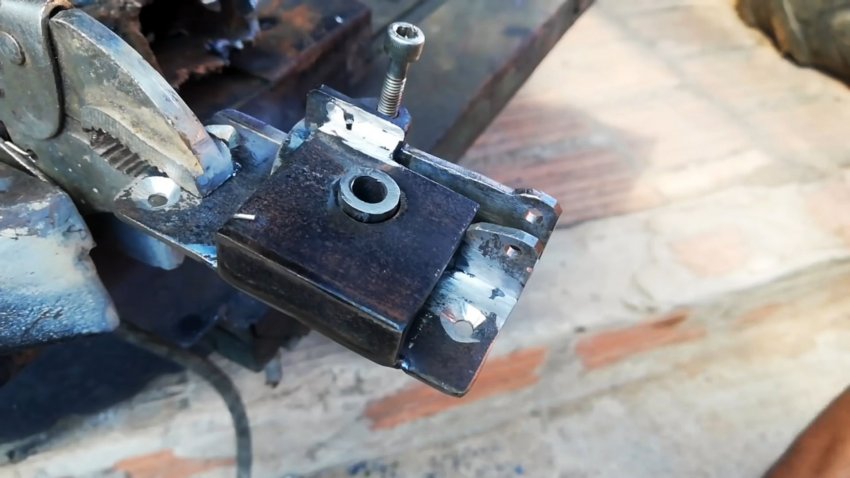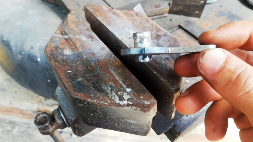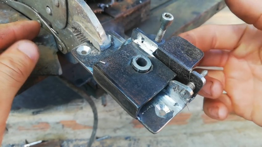Круглую втулку вставляем в отверстие защелки до середины и привариваем. Втулку снизу защелки укорачиваем. Удаляем наплывы металла болгаркой и ручным напильником. Внизу круглой части защелки делаем вырез-упор.
