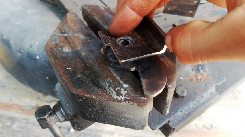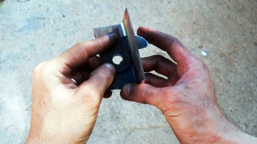 Надеваем на втулку квадратную деталь из большего уголка отверстием в полке. Вертикальную полку срезаем на 3/4 высоты, а в другой выполняем неглубокое открытое углубление от центра до края полки.