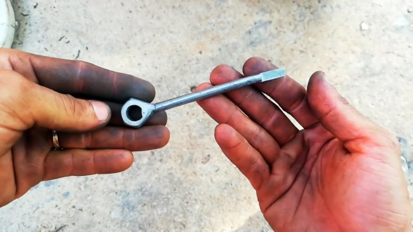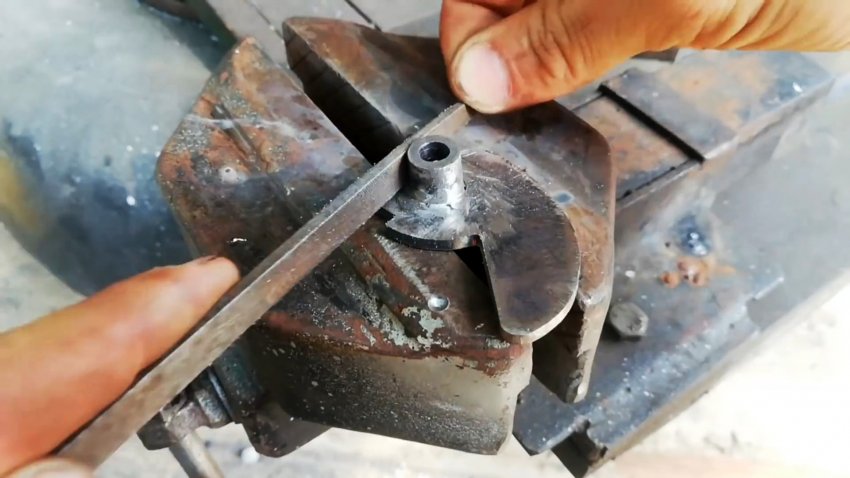 На конце круглого стержня сверлим поперечное отверстие и делаем с торца прорезь с фигурным дном, в которую на штифте крепим металлическую пластину с одним концом, повторяющим форму донца прорези.