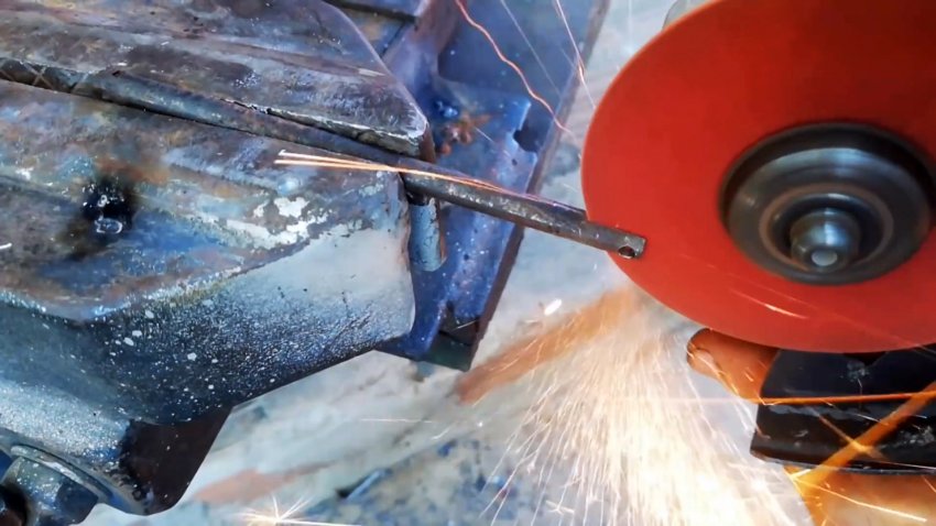 В полке уголка по метке сверлим отверстие и от ближнего торца выполняем болгаркой прорезь до отверстия. Обрабатываем кромки прорези ручным напильником, удаляя заусенцы и скругляя кромки.