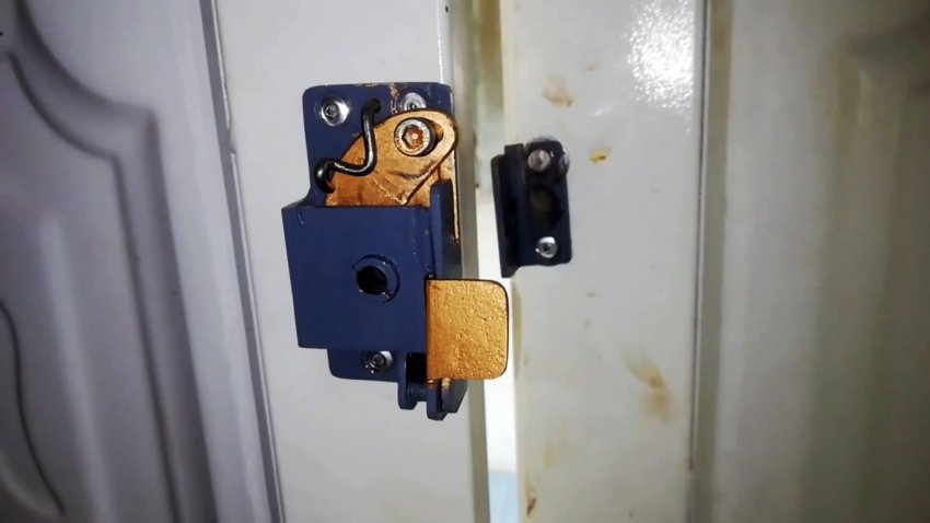 На дверном полотне напротив спусковой скобы замка крепим шурупами Г-образную деталь, которая при закрывании дверного полотна давит на спусковую скобу, освобождая защелку, и она, опускаясь, входит в прорезь Г-образной детали на дверном полотне, фиксируя его в закрытом положении.