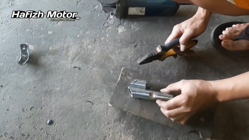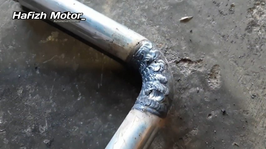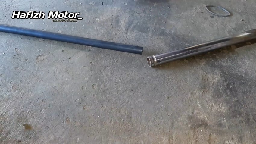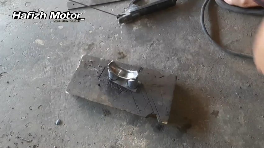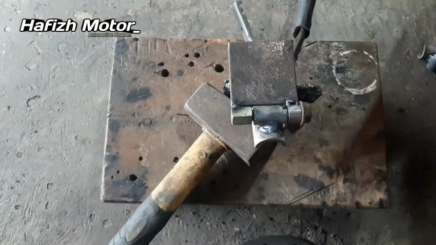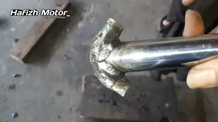 Одну половину нужно проварить по надрезам еще и внутри, а затем зачистить швы. Это нужно, чтобы заготовка не разогнулась под нагрузкой. К усиленной детали в центр приваривается трубка. Таким образом, получаем толкатель.