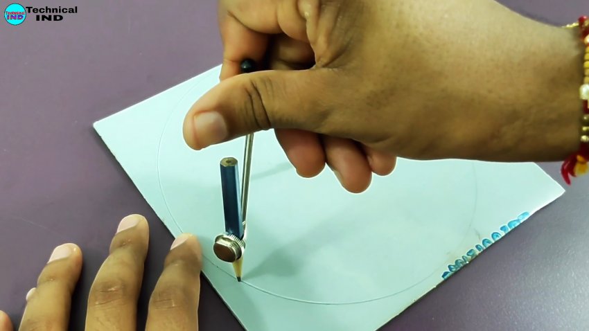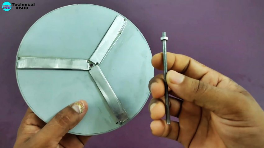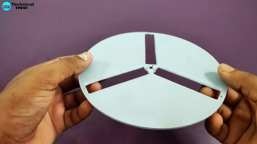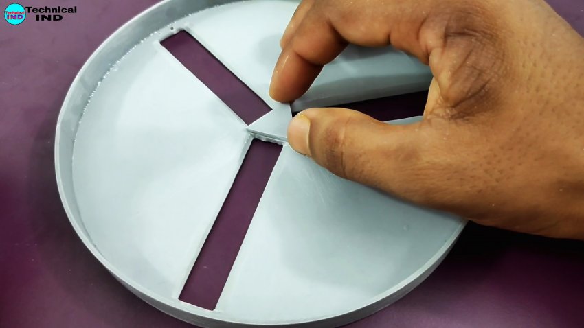 Из листа пластика вырезается диск диаметром 17 см. Его нужно просверлить в центре, и разметить на 3 равные сектора. В диске вырезаются окна под лезвия ножей.