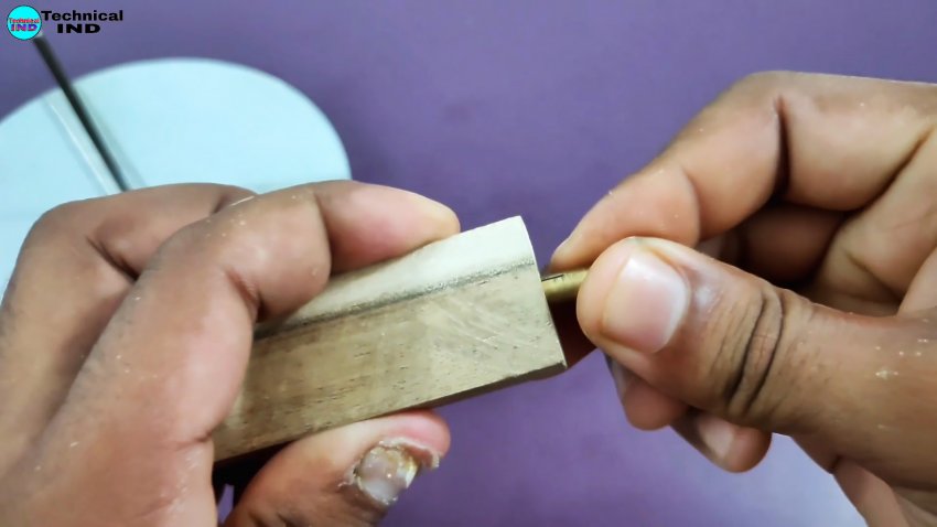 Далее необходимо отпилить от деревянной рейки заготовку длиной 80 мм, и просверлить ее вдоль. В нее забивается втулка из тонкой трубки. Это позволит оси легко проворачиваться без биения.