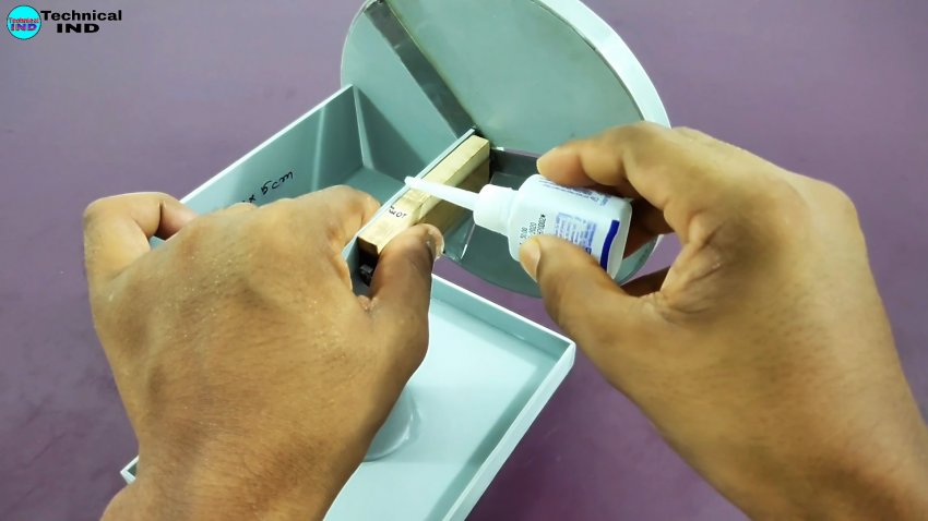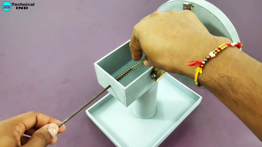 Затем необходимо вырезать пластину толкателя в лоток комбайна. Она должна легко в нем скользить. Задняя стенка лотка просверливается, и в отверстие вставляется шпилька или пруток. На него надевается пружина, и на край приклеивается пластина.