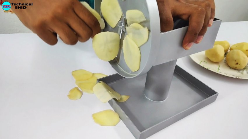 Картофельные чипсы можно готовить в домашних условия, но для этого очищенные клубни нужно очень тонко нарезать. Делать это ножом сложно и долго. Если же изготовить комбайн предложенной конструкции для шинковки, то нарезка с его помощью картофелины на тончайшие слайсы займет меньше минуты.