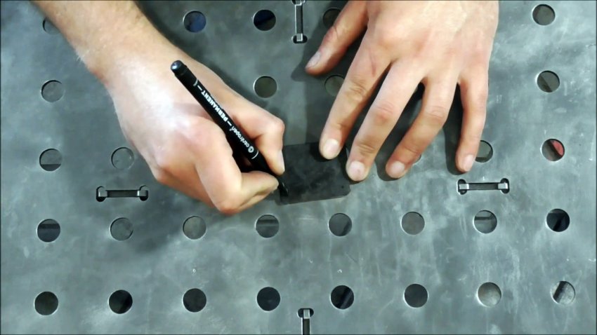На прямоугольной пластине со скругленными углами намечаем места для сверления четырех отверстий по углам и одно в центре.
