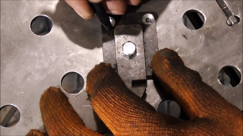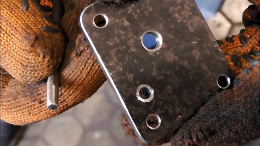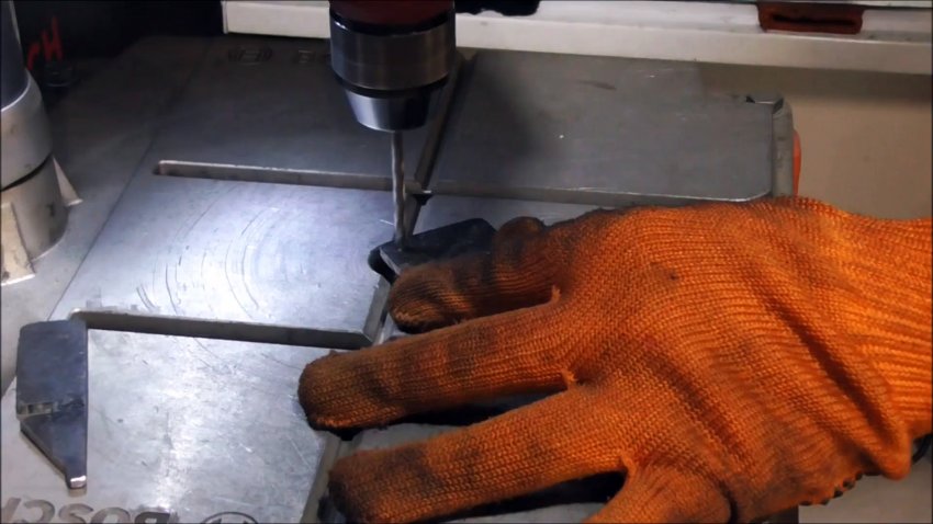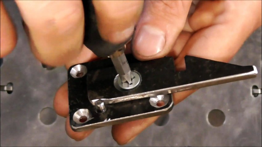 После накернивания всех отмеченных точек, выполняем отверстия на сверлильном станке и зенкуем их под головки винтов и шурупов. В центральном отверстии в пластине нарезаем с помощью метчика и воротка резьбу.
