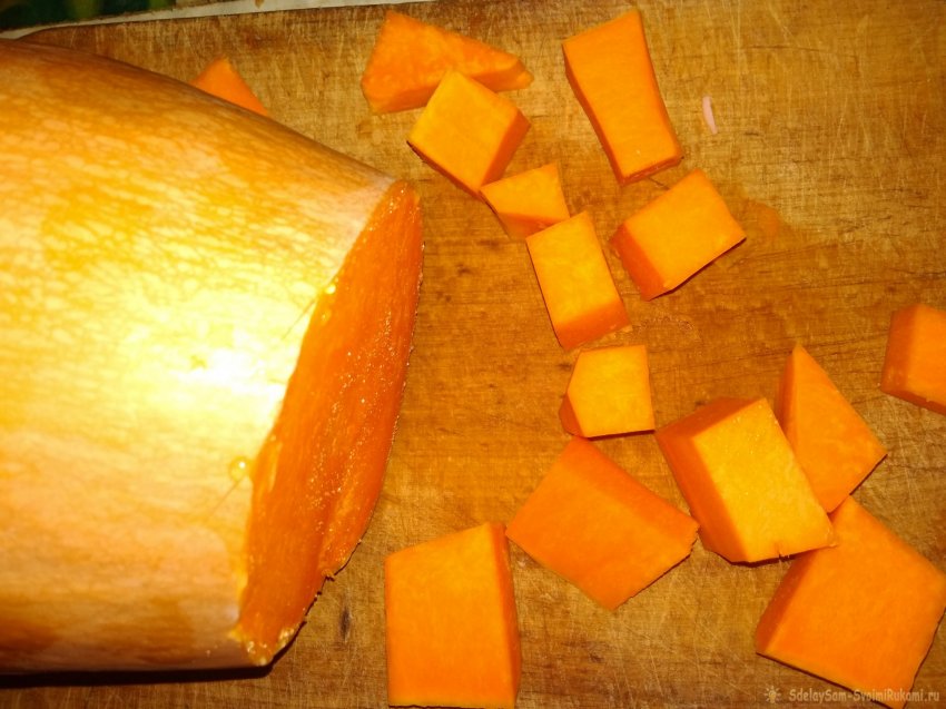 1. Тыкву очистить от грубой тонкой кожицы острым ножом. Семена и прилегающие к ним ткани овоща удалить.