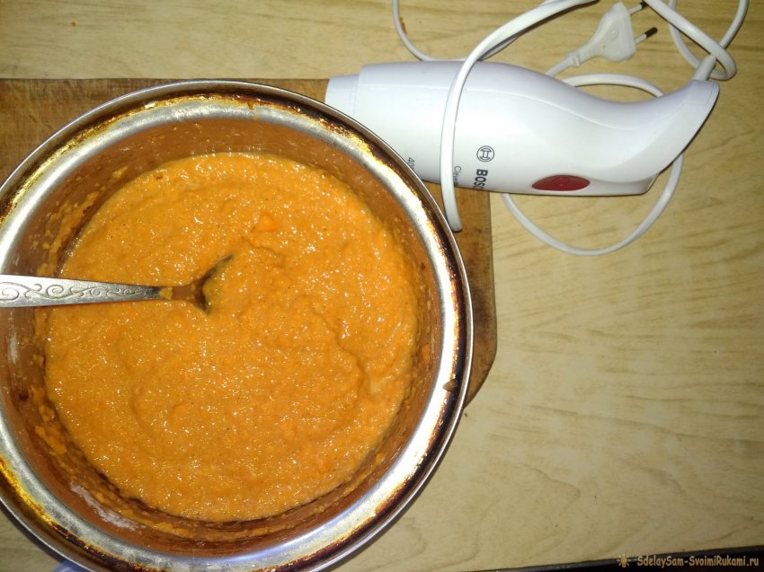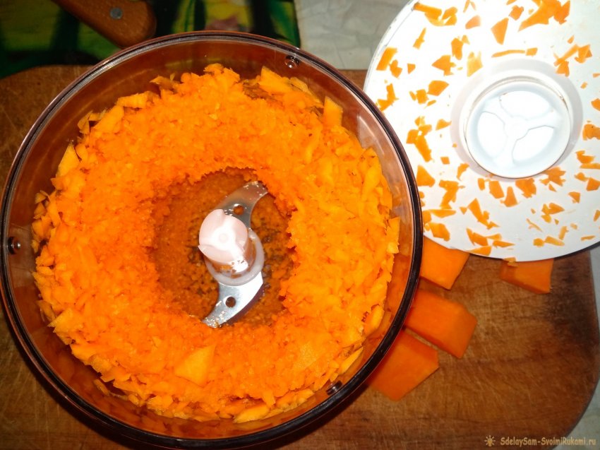 При отсутствии кухонного агрегата измельчить мякоть тыквы с помощью мясорубки или натереть на мелкой терке, как на деруны.