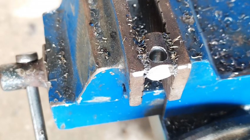 Отрезаем от прутка диаметром 15 мм валик высотой 20 мм. На его боковой поверхности со смещением к одному краю сверлим сквозное отверстие.