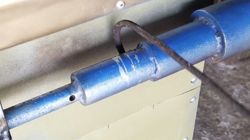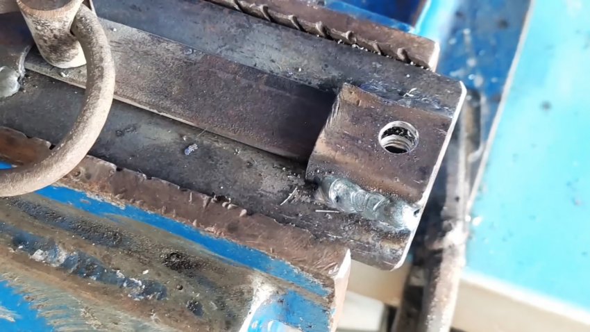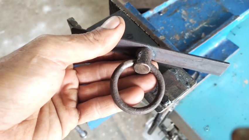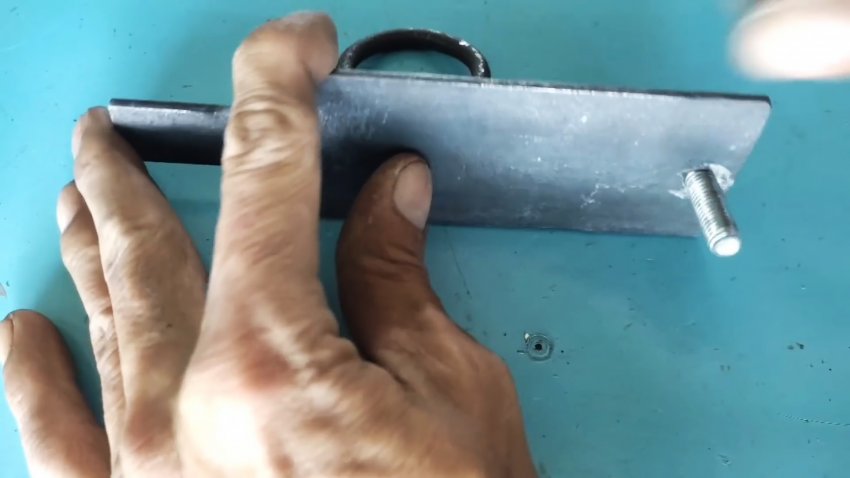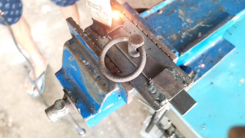 Укладываем вторую скобу на пластину, совмещая со свободным краем, заводим в нее полосу, прикладываем основание валика с кольцом к полосе посередине, обводим маркером и сверлим отверстие чуть меньше разметки. Прикладываем полосу отверстием к верху валика и завариваем.