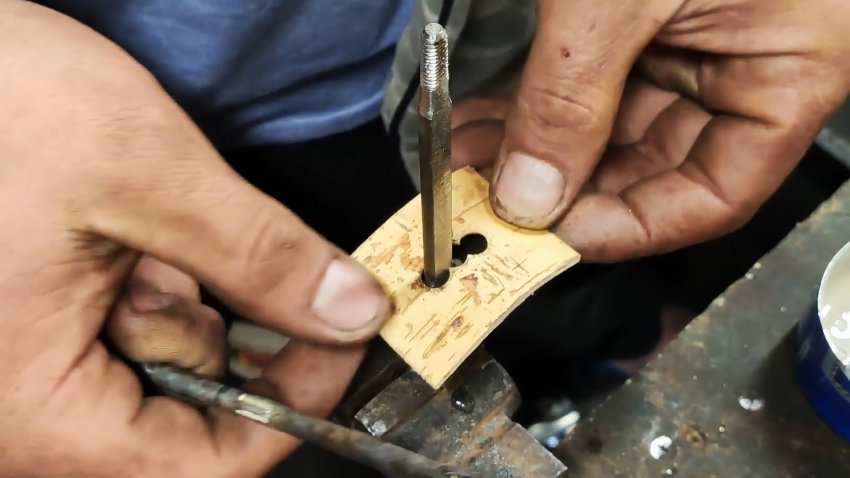 Сделать наборную рукоять из березовой коры можно на клинок оснащенный хвостовиком с резьбой на конце. Дополнительно нужно также изготовить из листового металла заготовку больстера, который будет располагаться между лезвием и ручкой, а также тыльника с резьбовым отверстием.