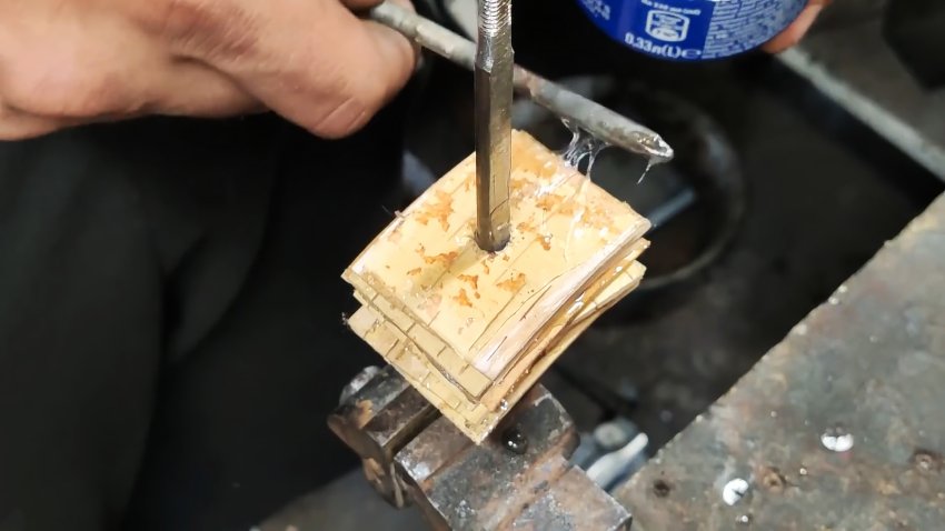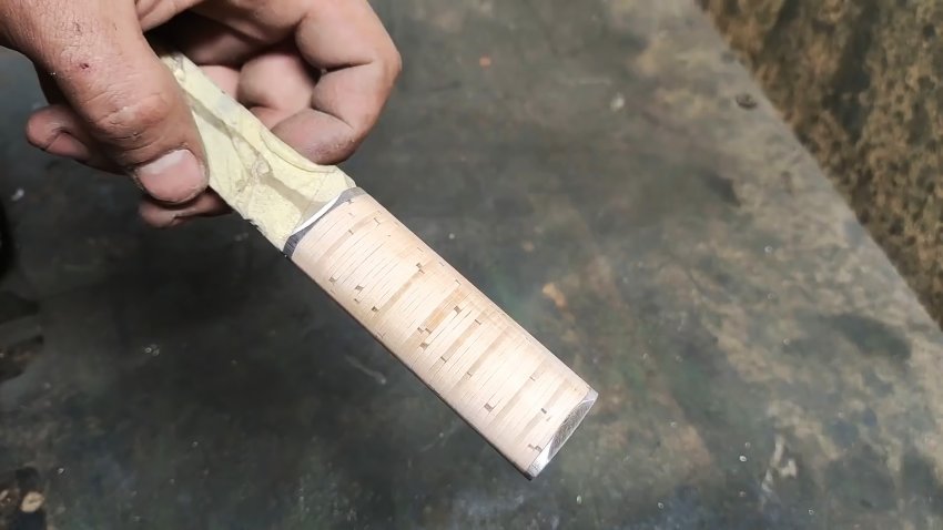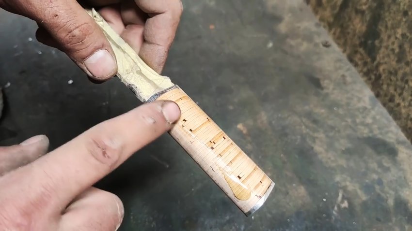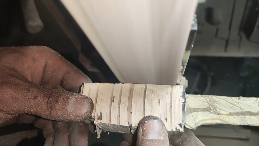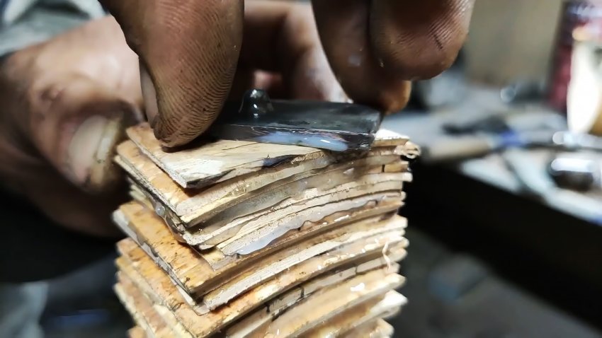 Нужно сжать им слои, и подождать пока клей схватиться. После застывания рукоять обтачивается.