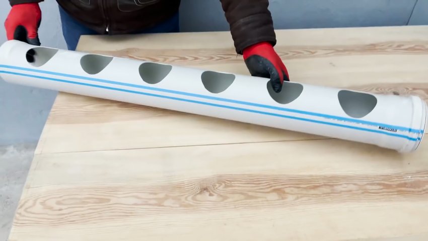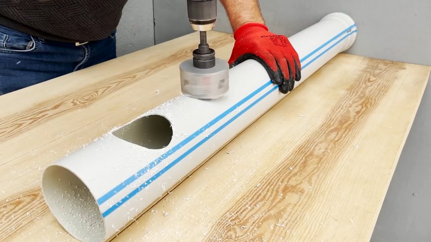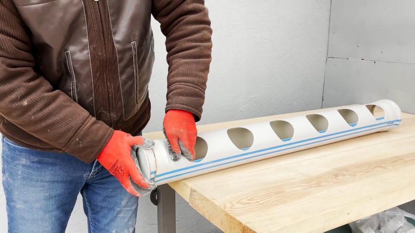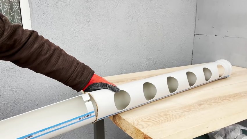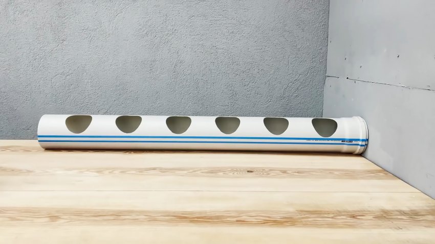 В качестве основания кормушки берем трубу длиной 1 метр. Отступаем от края 15 см, и просверливаем в ней отверстие для коронки. Далее засверливаемся до противоположного края с этим же шагом. После этого коронкой проделываем больше отверстия, через которые птица и будет иметь доступ к корму.
