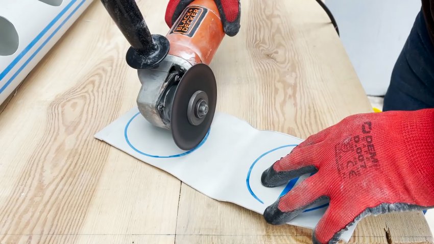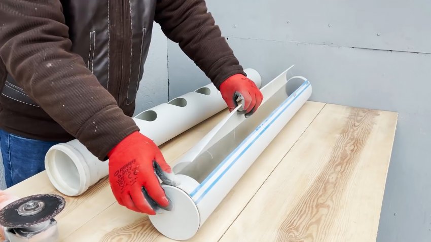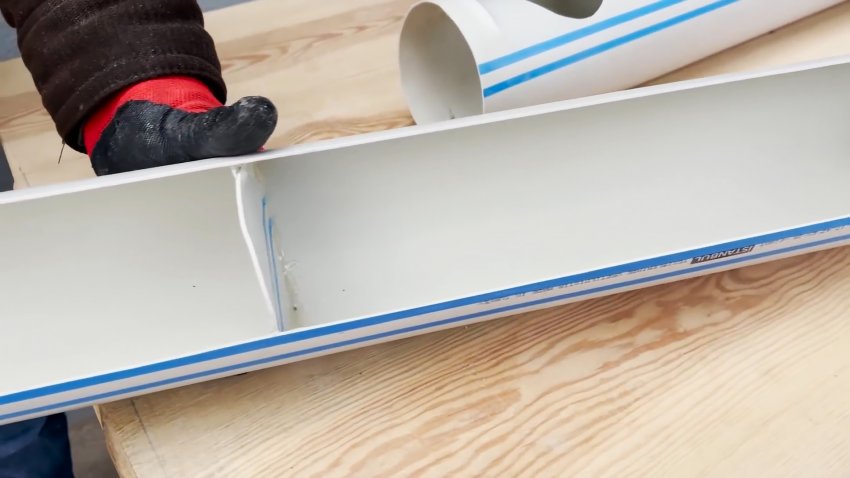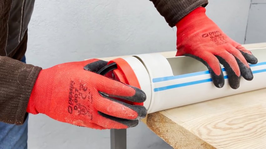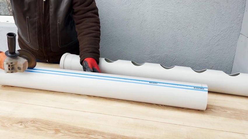 Затем вырезаем на последней трубе большое длинное окно, отступив немного от краев.