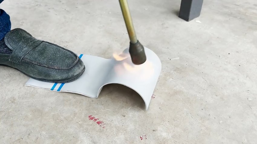 Далее режем отрезок трубы вдоль, греем его, и разравниваем в лист.