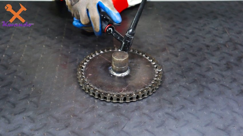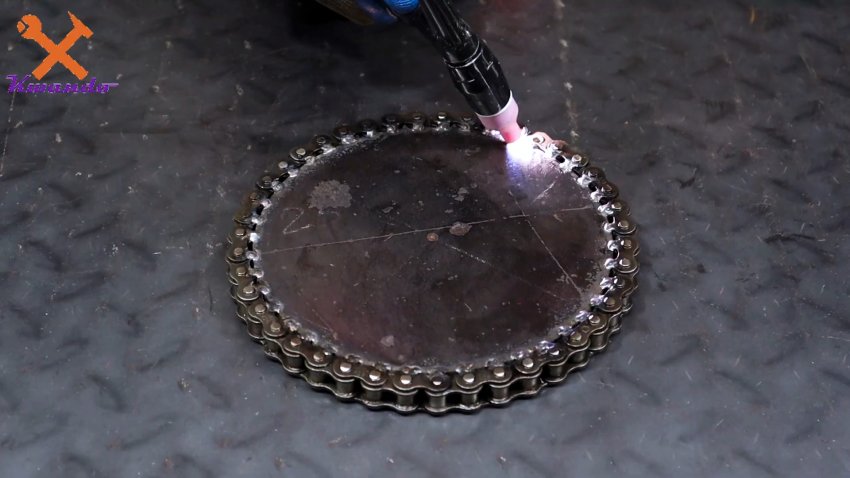Из толстой стальной пластины вырезаем диск. Затем наматываем на него роликовую цепь, и привариваем ее.